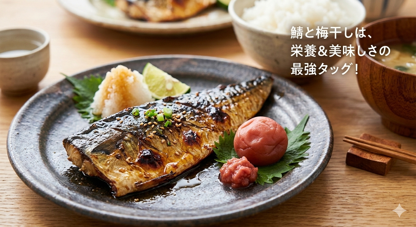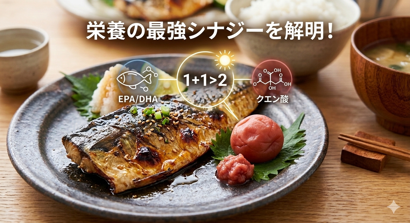 | 組み合わせ効果 | 酸化防止と吸収率アップ | 鯖のEPA/DHAは酸化しやすい弱点がありますが、梅干しの抗酸化作用がそれを守ります。また、クエン酸がカルシウムの吸収を助けるので、鯖缶などで骨ごと食べる時に最適です。 |