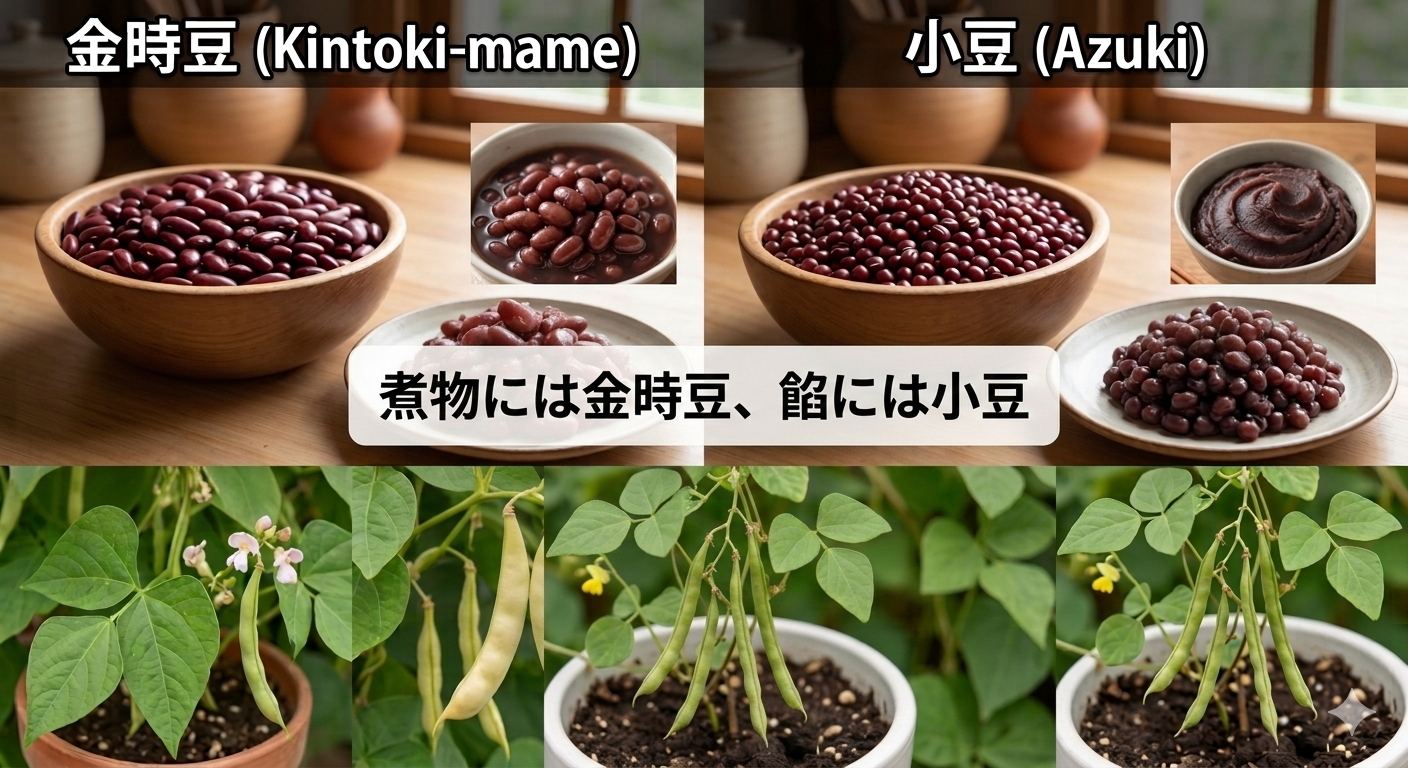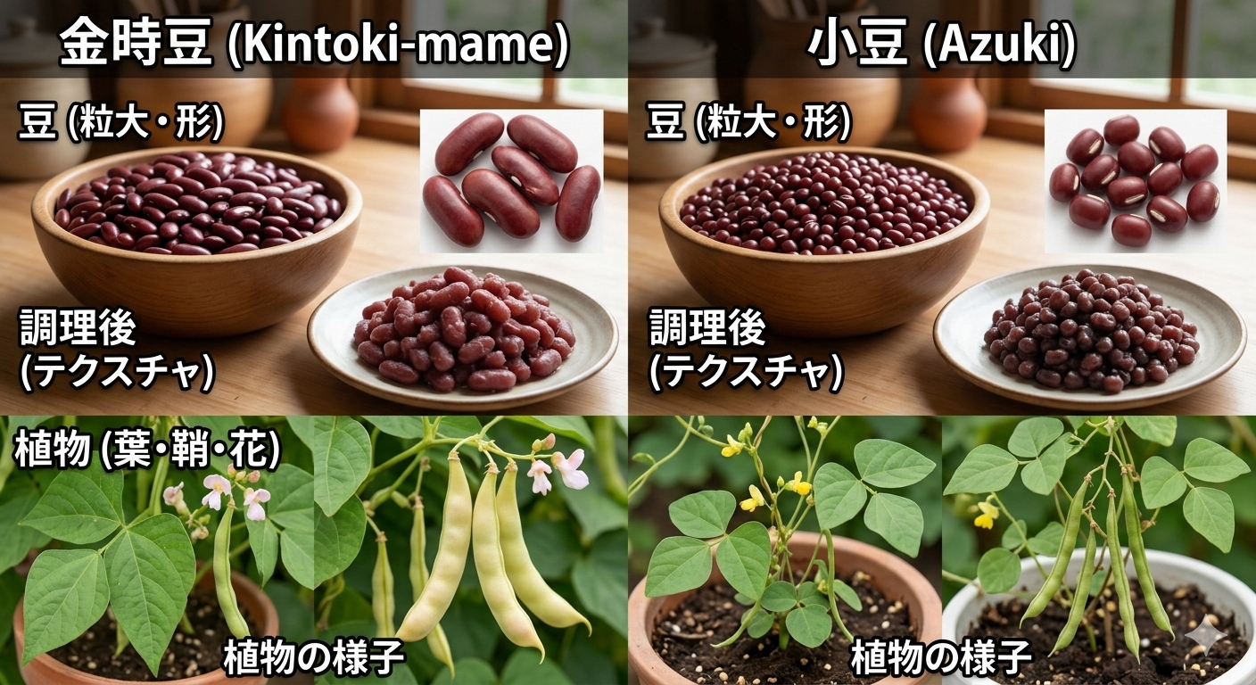 - 植物の種類が違う:小豆はササゲ属、金時豆はインゲンマメ属。