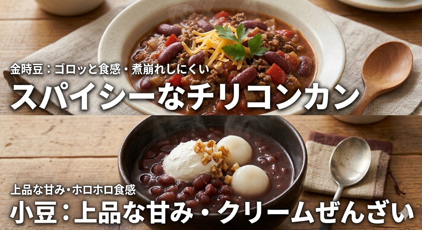 - 食感の違い:小豆はしっとり滑らか、金時豆はホクホクしっかり。