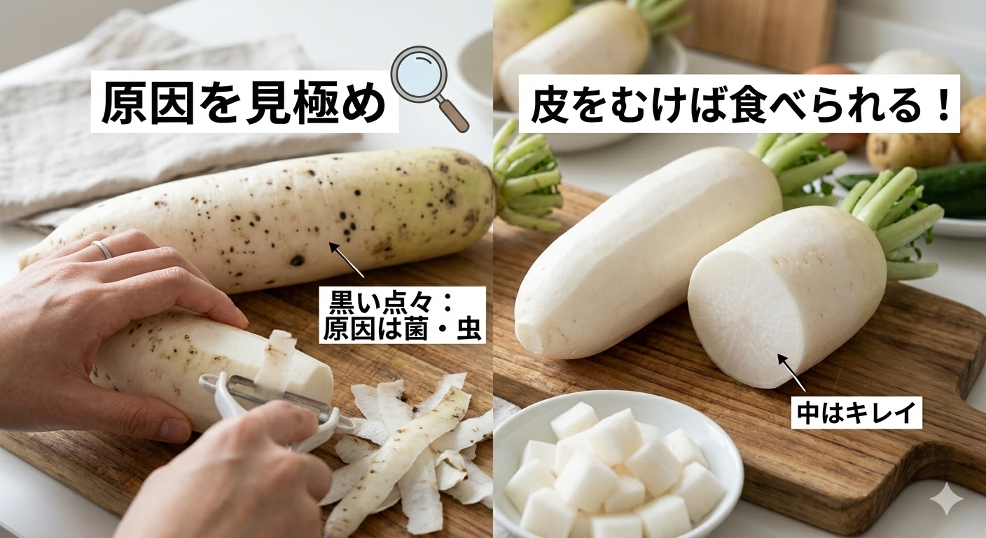 寒い季節、スーパーで立派な大根を買ってきて「さあ、今夜は温かいおでんにしよう!」と意気込んだのに、いざ調理しようとしたら「あれ?大根の皮に黒い点が」なんてこと、ありませんか?