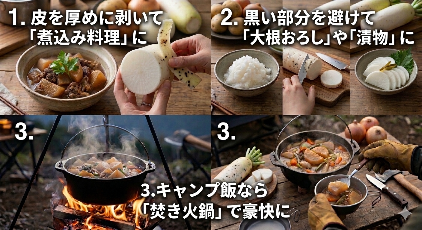 私たちキャンパーにとって、大根は冬キャンプの強い味方です。もしキャンプ場で切った大根に黒い点があっても、慌てる必要はありません。ダッチオーブンや大きなお鍋に、豚バラ肉と大根を放り込んで、焚き火でコトコト煮込む「豚バラ大根鍋」なんていかがでしょうか?