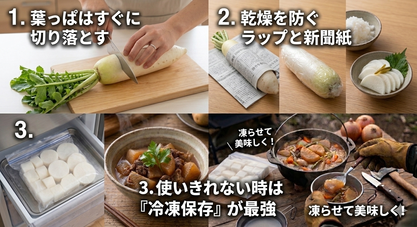 大根は乾燥が大敵です。しかし、水分がついたまま密閉すると今度はカビの原因になります。丸ごとの場合は、新聞紙やキッチンペーパーで包んでから、冷暗所または冷蔵庫の野菜室に立てて保存するのが理想です。