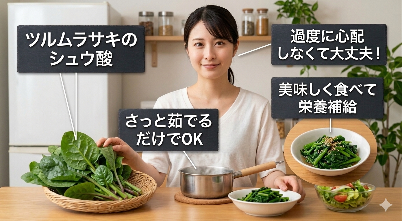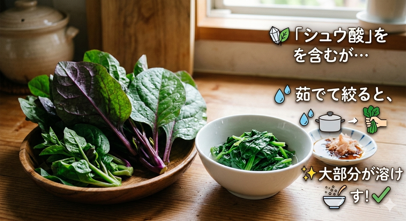 実は、ツルムラサキに含まれるシュウ酸の量は、私たちが普段よく食べている「ほうれん草」よりも少ないとされているんです。つまり、ほうれん草をお浸しやソテーにして美味しく食べているのと同じように、ツルムラサキも適切な処理をすれば全く問題なく楽しめる野菜なんですね。