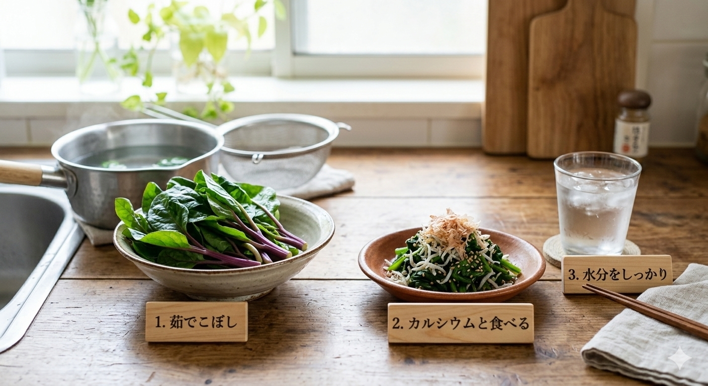 先ほどお話しした通り、シュウ酸は「水に溶けやすい」という性質を持っています。これを利用しない手はありません。一番確実で効果的な方法は、たっぷりのお湯で茹でて、そのお湯を捨てる「茹でこぼし」です。