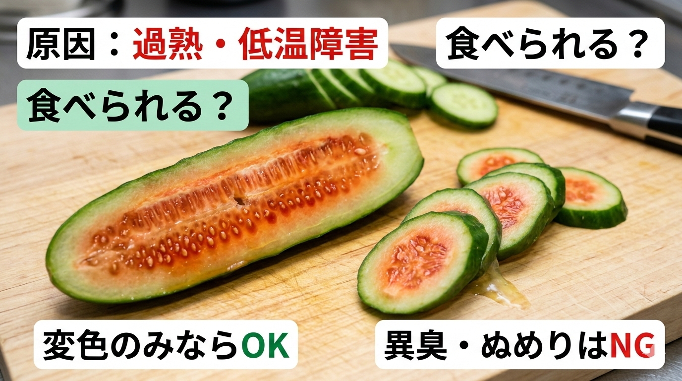 サラダや漬物にしようと思って、冷蔵庫から取り出したきゅうり。包丁を入れた瞬間、断面を見て「えっ!?」と声を上げてしまったことはありませんか?いつもなら瑞々しい緑色のはずの中心部分が、なぜか赤っぽく変色している。これって、すごくびっくりしますよね。