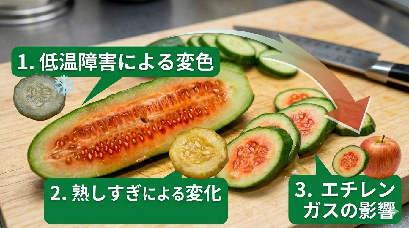 - きゅうりの中が赤いのは、主に「低温障害」や「熟成」が原因。