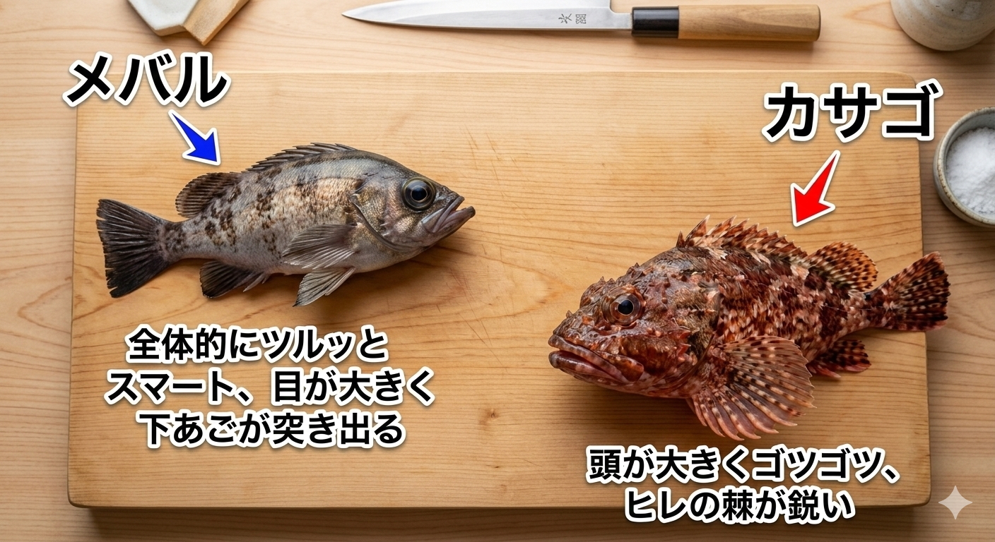 - ✅ 見た目:メバルは目が大きく受け口でスマート。カサゴは頭が大きくゴツゴツしている。