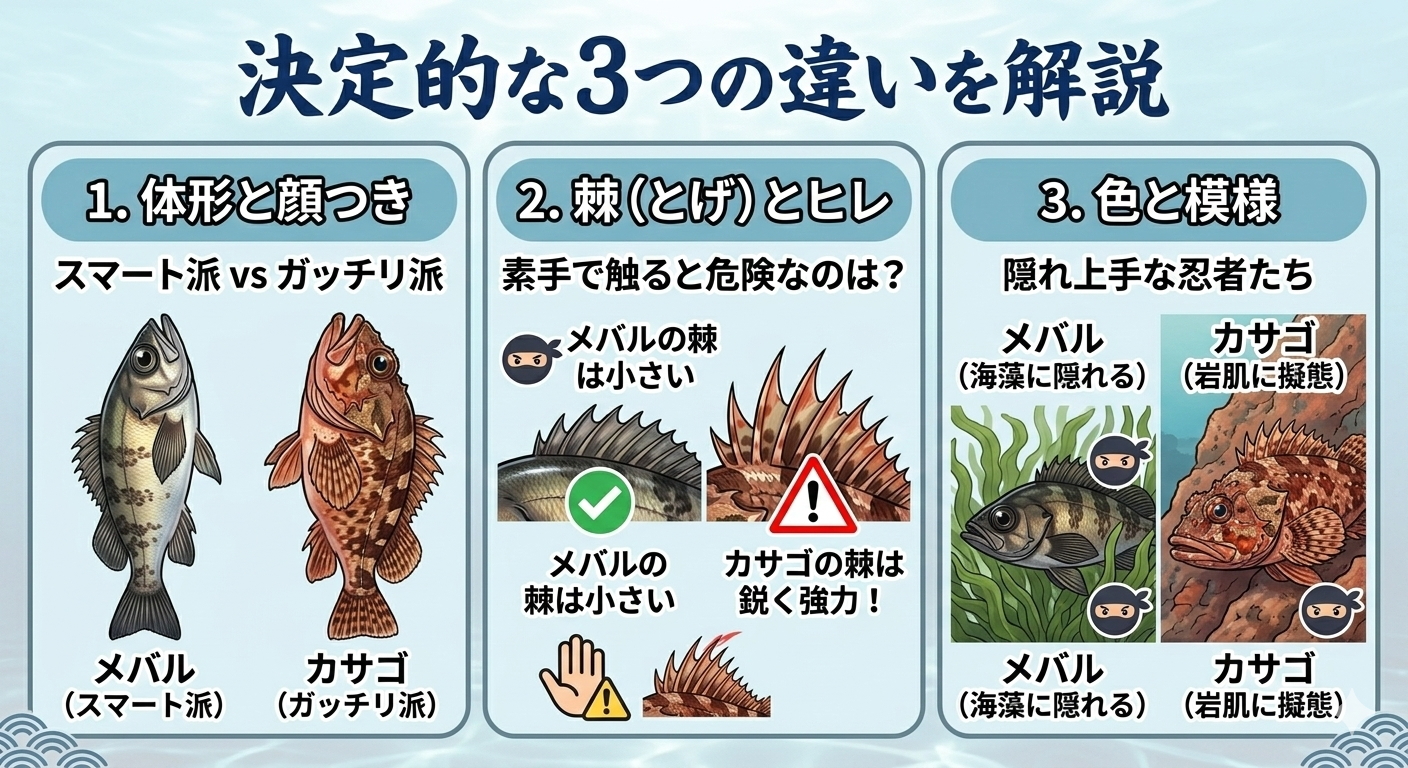 もし次に海へ出かけたとき、あなたの竿にどちらかの魚がかかったら、ぜひじっくりと顔を見てあげてください。「君は受け口だからメバルさんだね」「君は鎧を着てるみたいだからカサゴさんか」なんて会話しながら、その命を美味しくいただく。