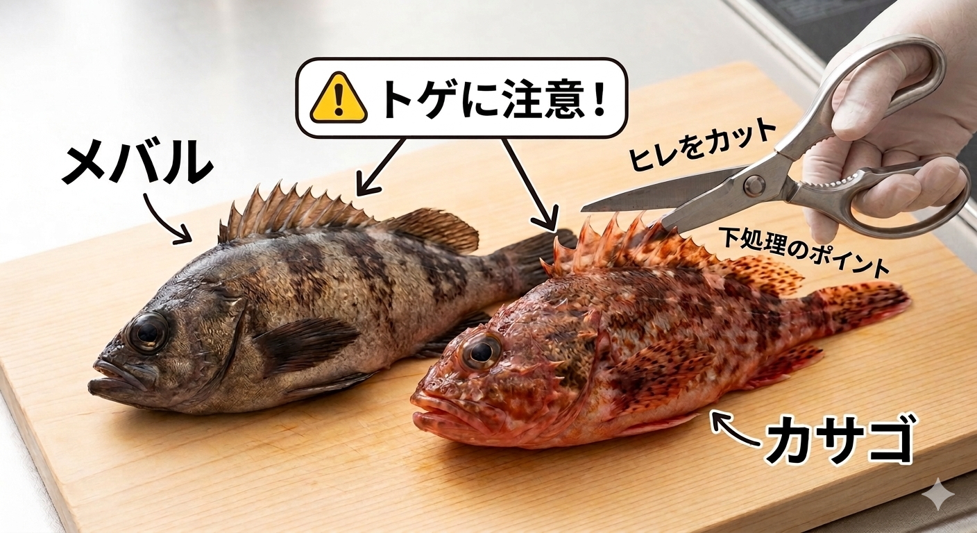 - ✅ 危険性:カサゴのヒレには鋭い棘(毒棘の可能性あり)があるため、調理前にハサミでカットするのが安全。