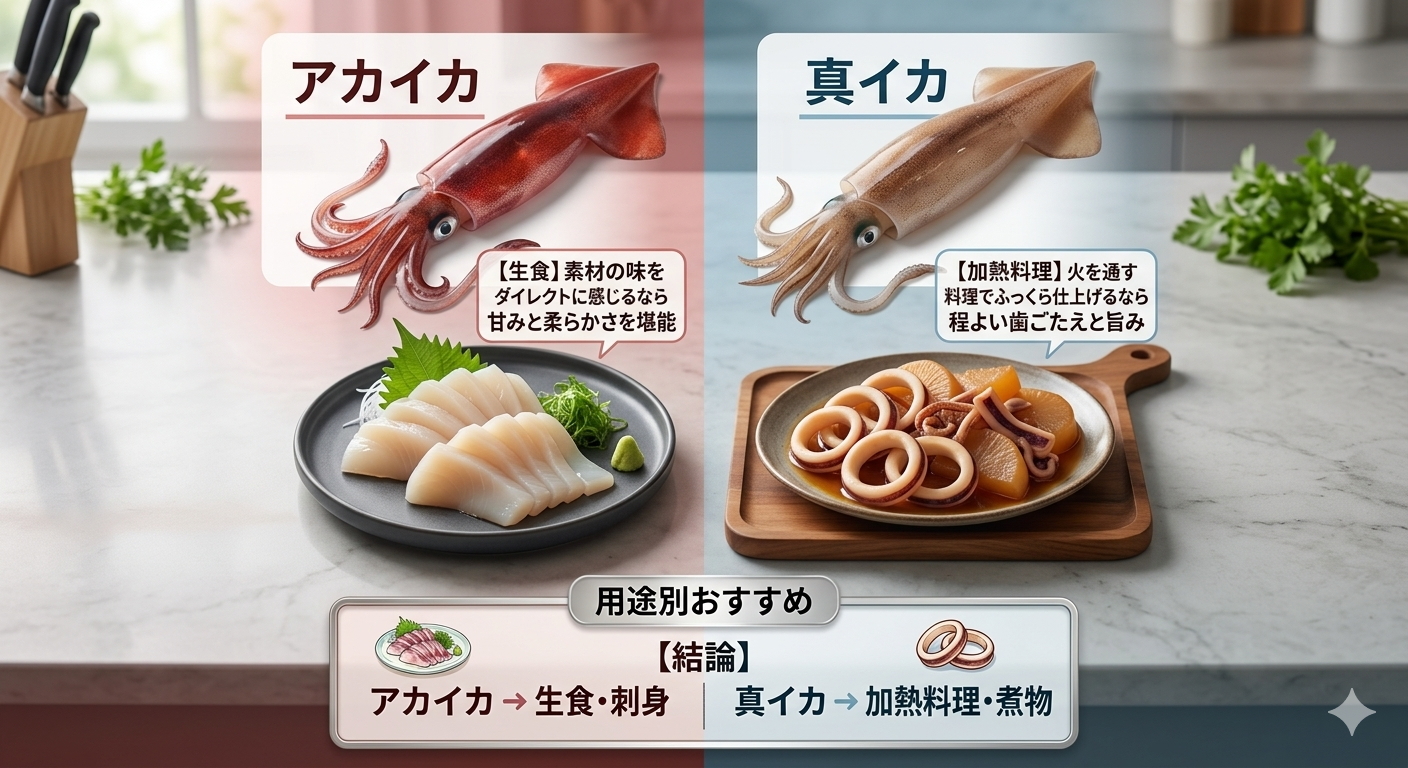 それぞれの持ち味をひとことで表現するなら、真イカは「噛みごたえと強い甘み」、アカイカは「柔らかさと上品なさっぱり感」と言えるかもしれません。普段何気なく口にしているイカですが、その正体を知ると、料理のバリエーションがぐっと広がります。