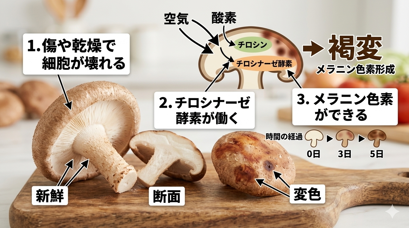 2026年時点の最新の専門家の見解でも、このチロシンの酸化による変色は「毒性はなく安全に食べられる」と一致しています。傘の裏側のヒダや、軸、切り口などに現れやすいので、もし見つけても焦らないでくださいね。