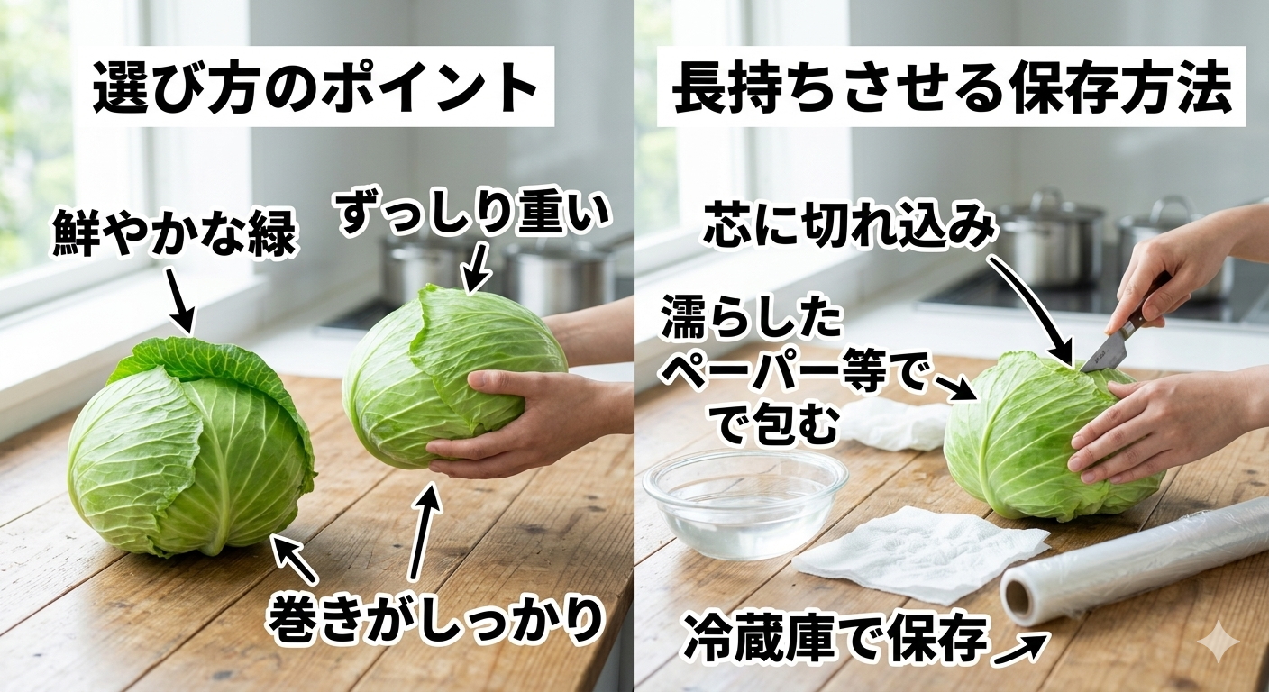 キャベツを選ぶ時は、季節によってチェックするポイントが少し違うんです。知っておくと、お買い物カゴに入れる時にちょっと自信が持てますよ。