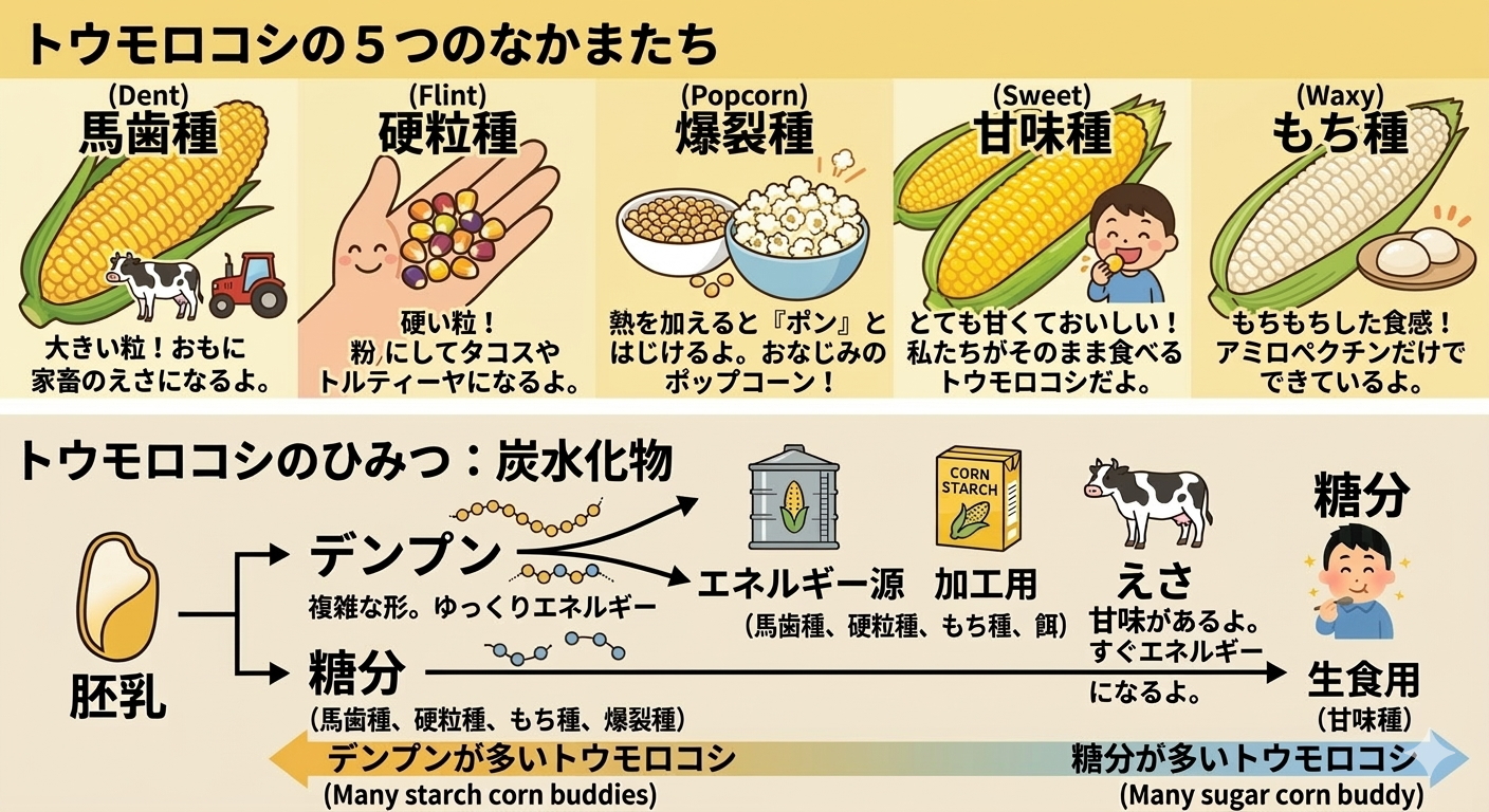 お米やパン、うどんと同じグループに入ると聞くと、なんだかお腹にしっかりたまるイメージが湧いてきませんか?この分類を知っておくと、「今日はご飯の代わりにトウモロコシを主食にしてみようかな?」といった新しいアイデアも生まれるかもしれませんね。