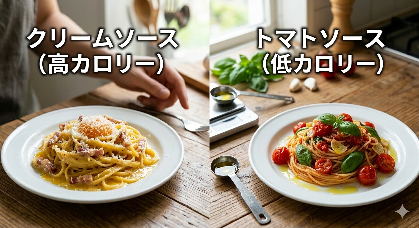 もし「今日は少しカロリーを抑えたいな」という時は、トマトベースのソースや、きのこをたっぷり使った和風ソースを選ぶのがおすすめです。