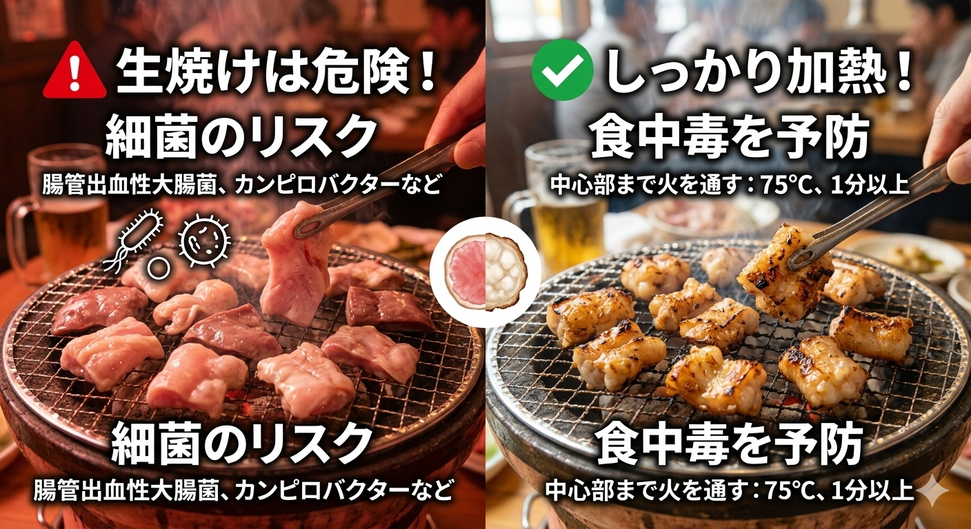 ただ、屋外での調理は環境によって見え方が変わることもあります。だからこそ、見た目だけでなく、トングで触った感覚なども合わせて確認することが安心につながります。次からは、なぜこれほどまでに加熱に気をつける必要があるのか、その理由について詳しく見ていきましょう。