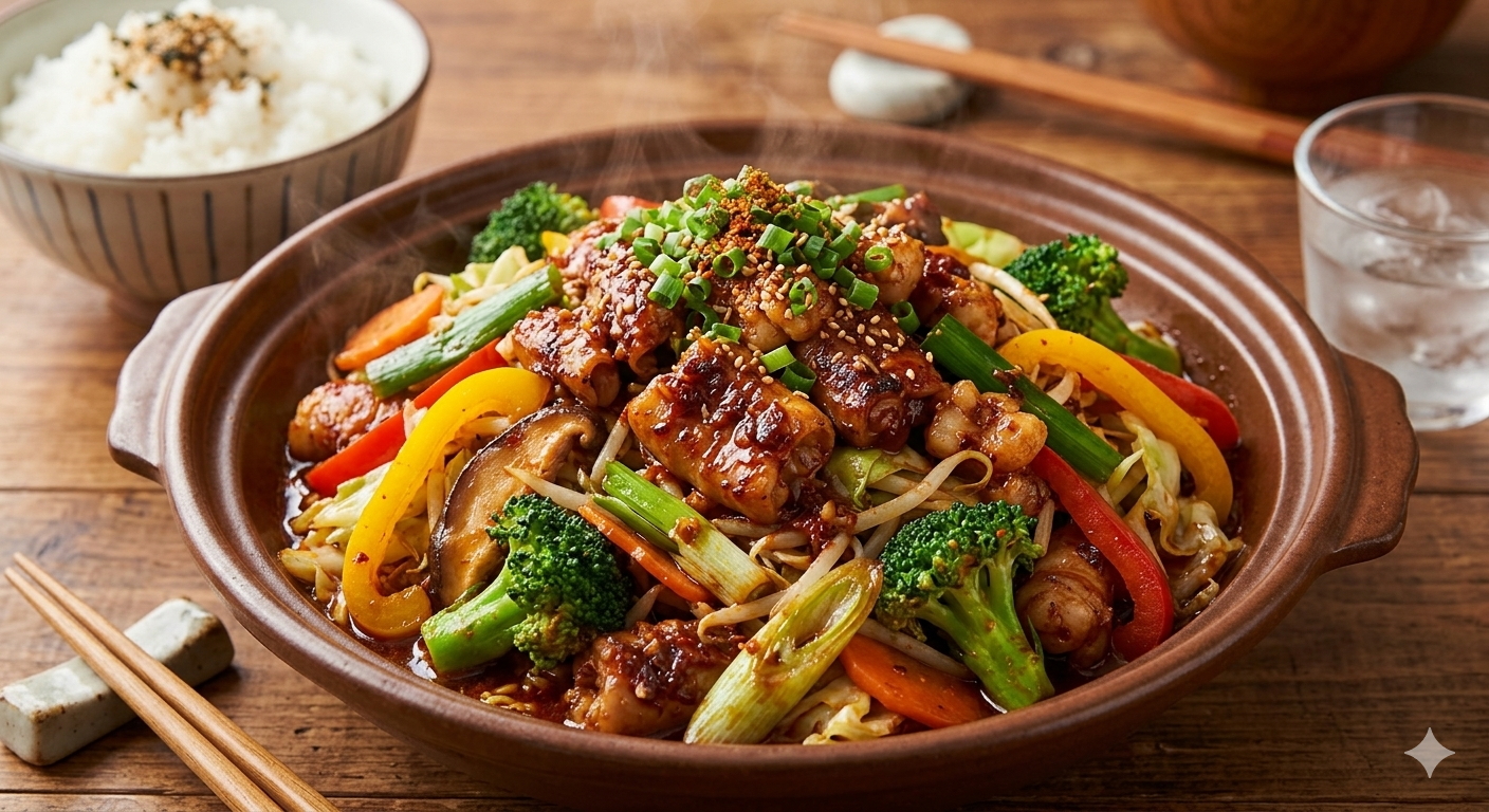 シマチョウとたっぷり野菜の旨辛味噌炒め