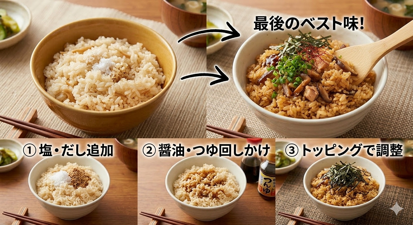 味が薄いと感じたときは、炊き上がった後に塩や醤油、ほんだし、塩昆布などの調味料を少量加えて混ぜるだけで、簡単に美味しい味に修正することができます。作り直す必要がなく、今ある食材でさっとアレンジできるのが最大の魅力なんですね。